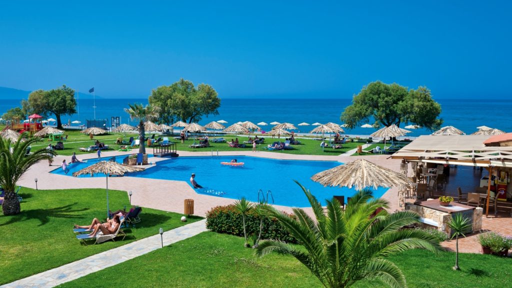 częściowo odnowiony na sezon 2017 kompleks czterech 1-piętrowych budynków recepcja (24 h) restauracja, bar w lobby i przy basenie ręczniki plażowe (6 EUR/tydz.) Wi-Fi (bezpłatne) kącik internetowy (ok. 2 EUR/15 min) kącik TV minimarket sejf (ok. 20 EUR/tydz.) 146 pokoi